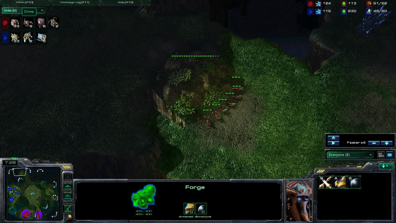 Notice here that I have sent my second overlord to my close position's ramp to spot any probes that can build a proxy pylon. Also, I scout the edges of other places with my zerglings. I quickly kill the probe with two zerglings to prevent any super early push.